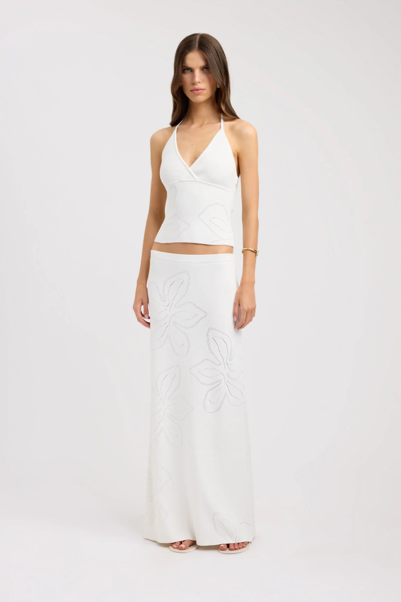 Bright and feminine, the Cancun Top is a playful staple for summer styling. Crafted from a soft stretch fabric, it features a flattering wrap-style front with delicate floral embroidery for a subtle textured finish. The halter neckline ties at the back for an adjustable fit, while the open back adds a touch of allure.