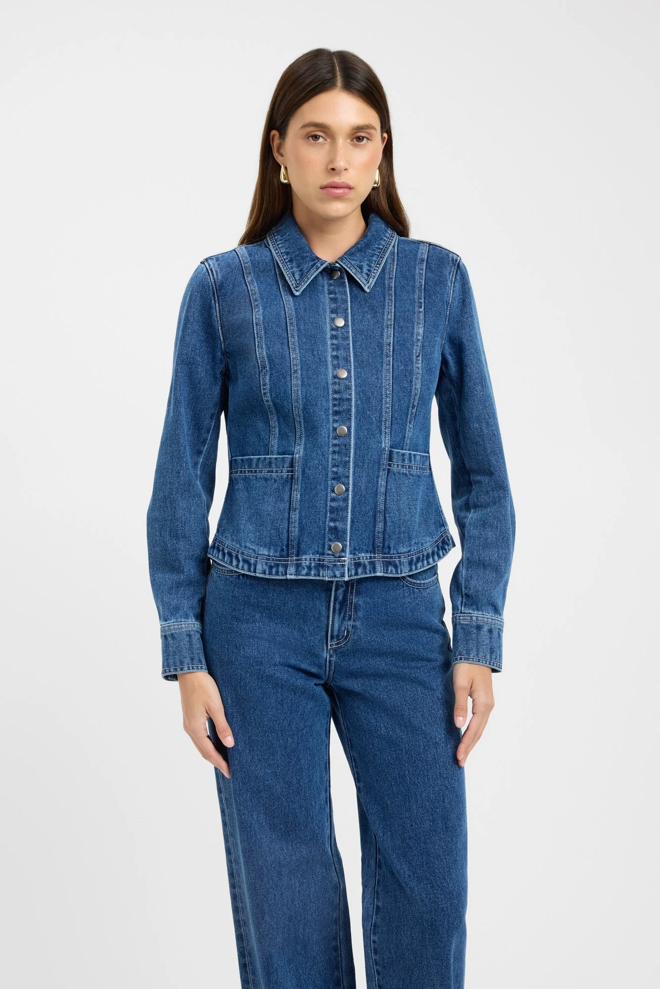Introducing the Kai Snap Jacket in an antartic blue colourway, an essential part of your Denim Edit. This structured jacket is cinched at the waist for a tailored fit, featuring a collared neckline and panel detailing that enhances its sleek, structured appeal. Pair with the Kai Straight Leg Jeans for a complete, elevated look.